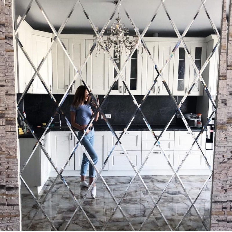 Использована серебристая квадратная зеркальная плитка